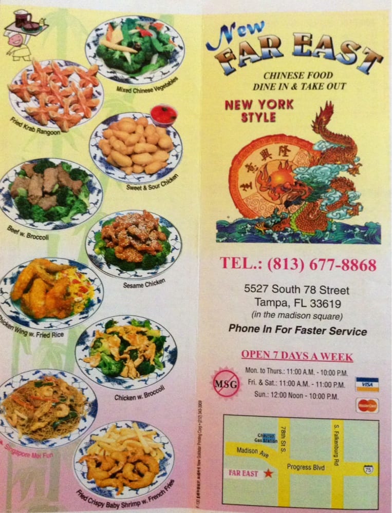 New Far East Chinese Rest, located in Tampa, FL, offers a delightful menu filled with seafood and Chinese cuisine. From classic soups like Egg Drop and Wonton Soup to appetizers like Egg Rolls and Spring Rolls, the offerings here are sure to satisfy any craving. Family dinners for both small and large groups cater to various appetites, featuring dishes like General Tso's Chicken and Shrimp Fried Rice. Customers praise the hot and fresh flavors of the food, with favorites like the sweet and spicy chicken and perfectly cooked Lo Mein. Despite minor critiques, the overall quality and taste make New Far East a go-to spot for flavorful Chinese dishes. From quick takeout to dining in, this restaurant provides a taste of authentic Chinese cuisine in a welcoming setting.